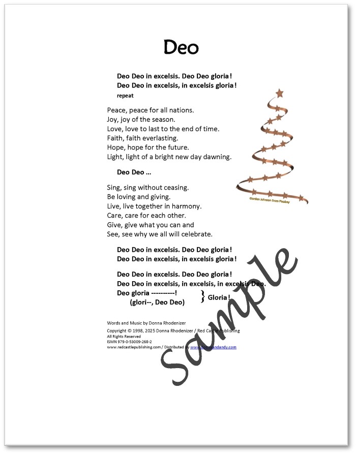 Deo is one of 12 songs from the song collection "It's Christmas Time". Donna Rhodenizer has written these songs in a variety of styles and skill levels for singers from ages 5-12+.
